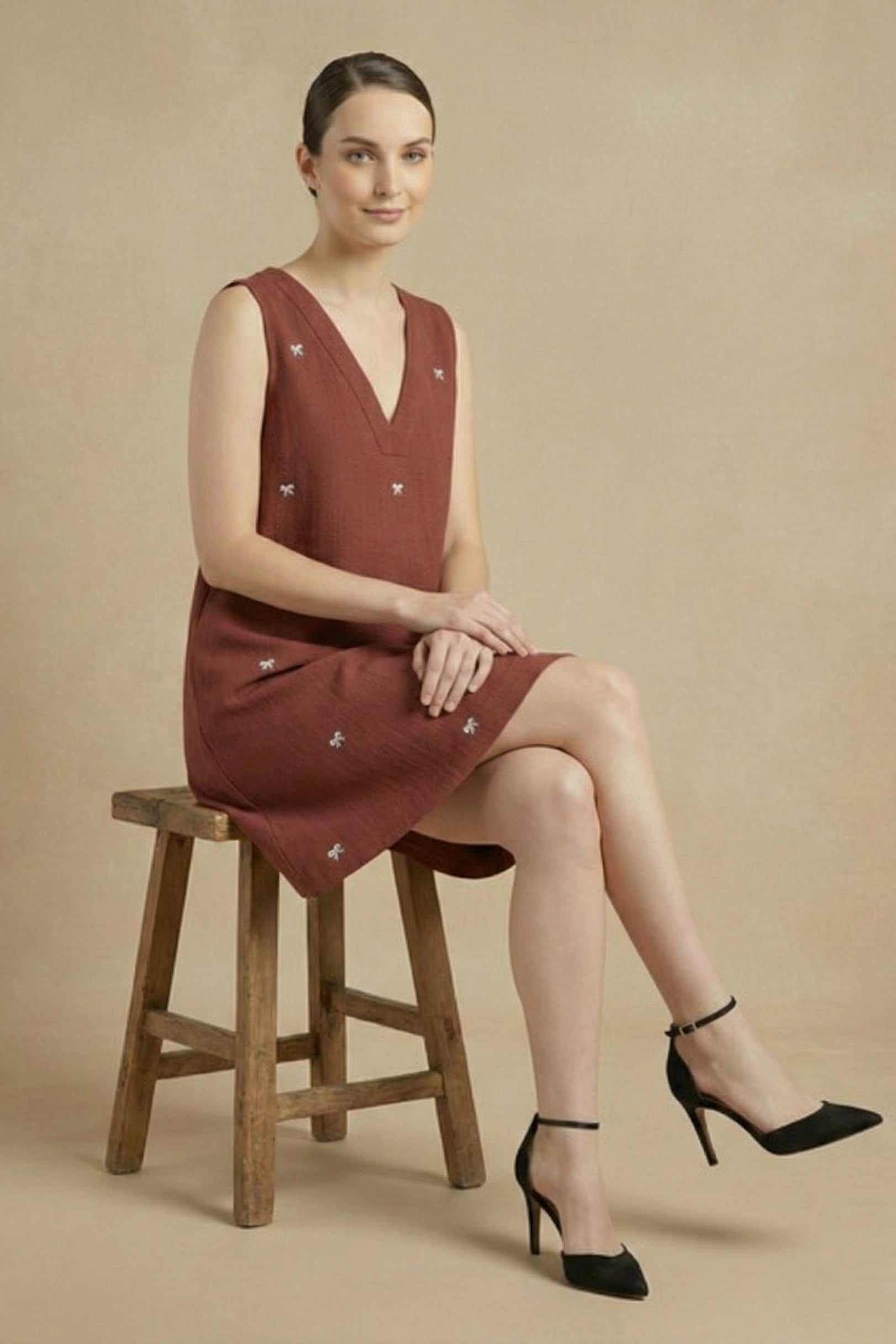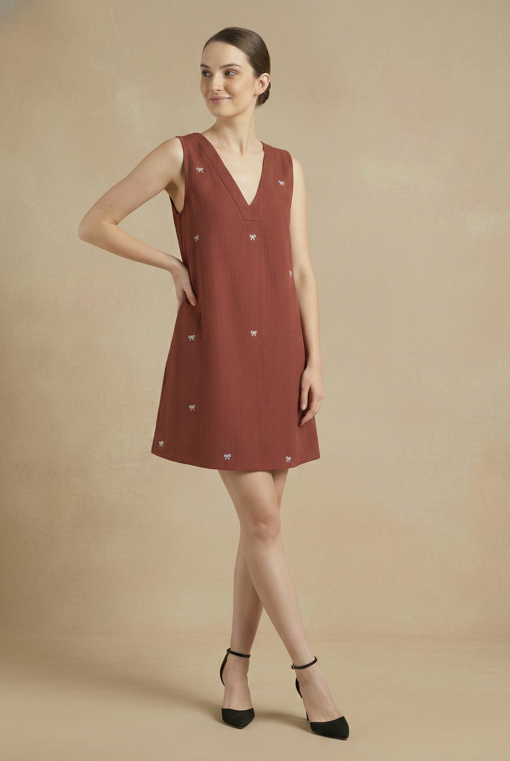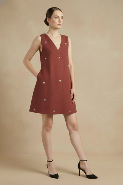 Delicate hand-embroidered mini bow motifs dance across the rich maroon canvas, adding a playful touch reminiscent of childhood craft notebooks, ribbon boxes, and carefree summer dressing. The easy A-line silhouette, deep V-neckline, and hidden pockets make it both flattering and functional—perfect for long days when comfort is your love language.