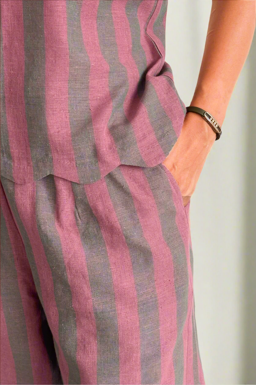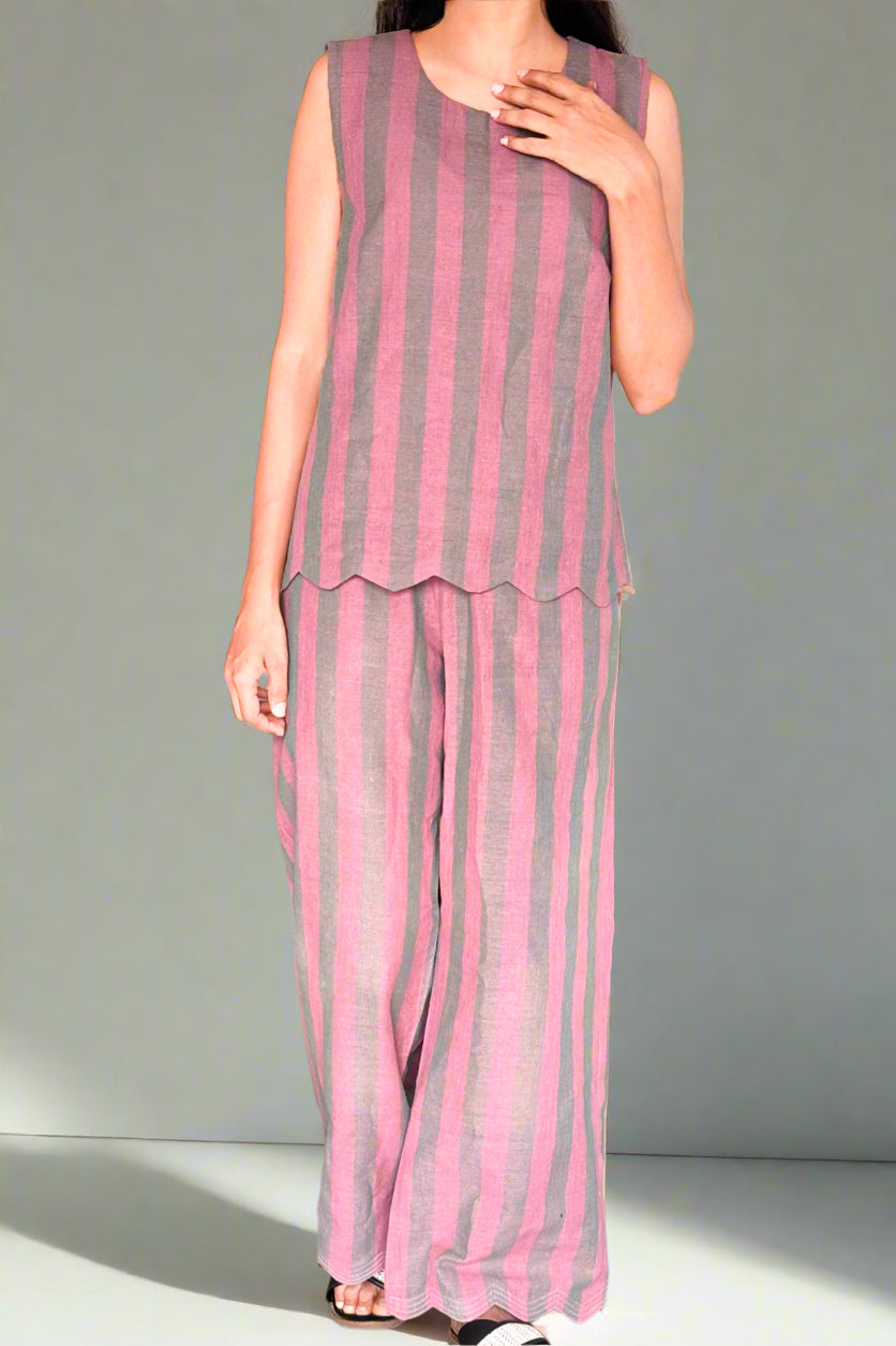 A playful yet poised coord set crafted in breathable handwoven Kala cotton fabric, the Berry Glow Set features soft scalloped detailing that lends a feminine edge to its structured silhouette. The vibrant berry and muted grey stripes strike a balance between bold charm and everyday ease, making it an effortless choice for both relaxed outings and elevated occasions. Designed for comfort with a modern cut, this set embodies the spirit of House of Tanvi — where artisanal craft meets contemporary living.