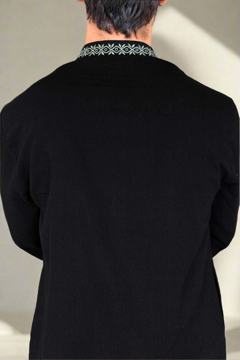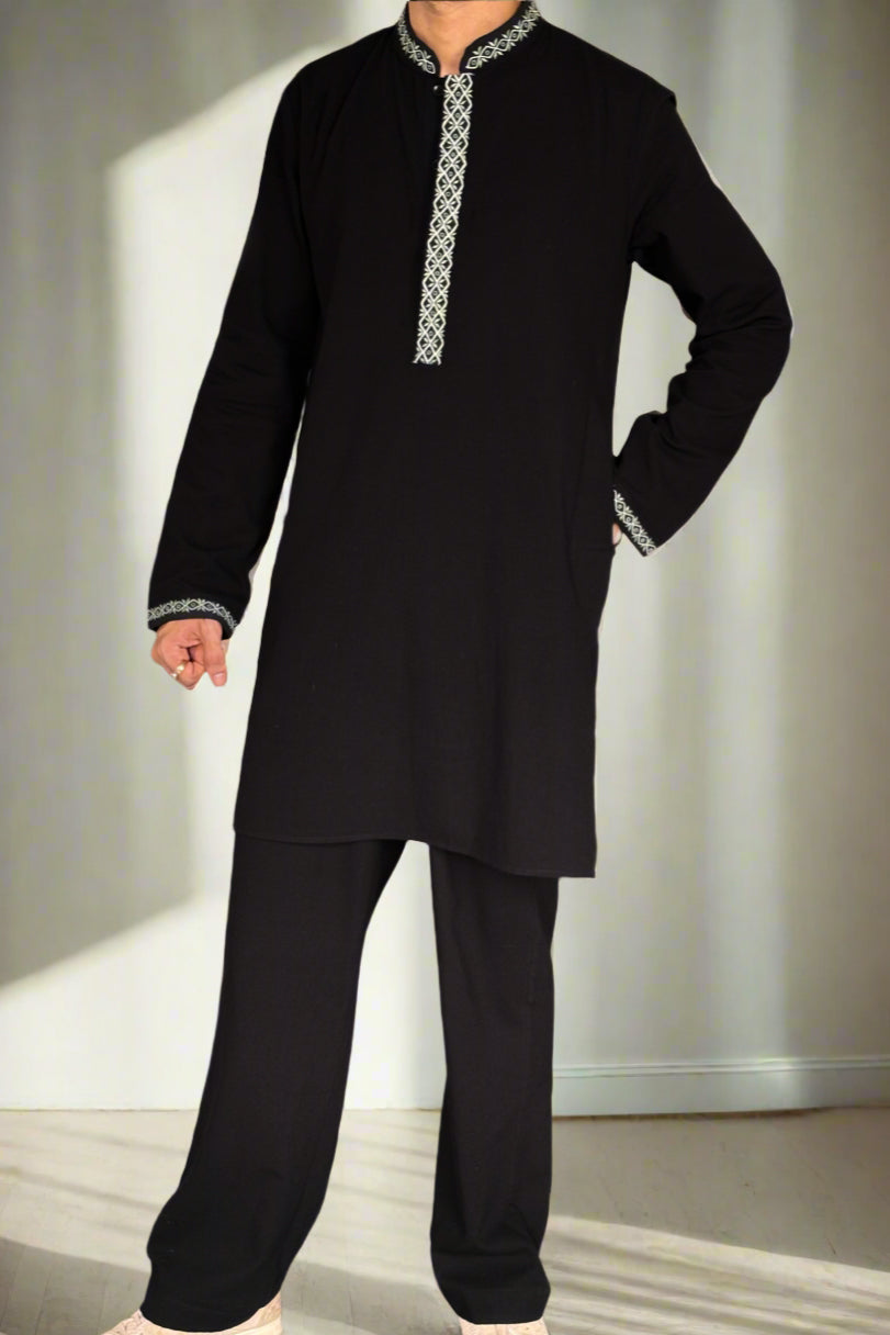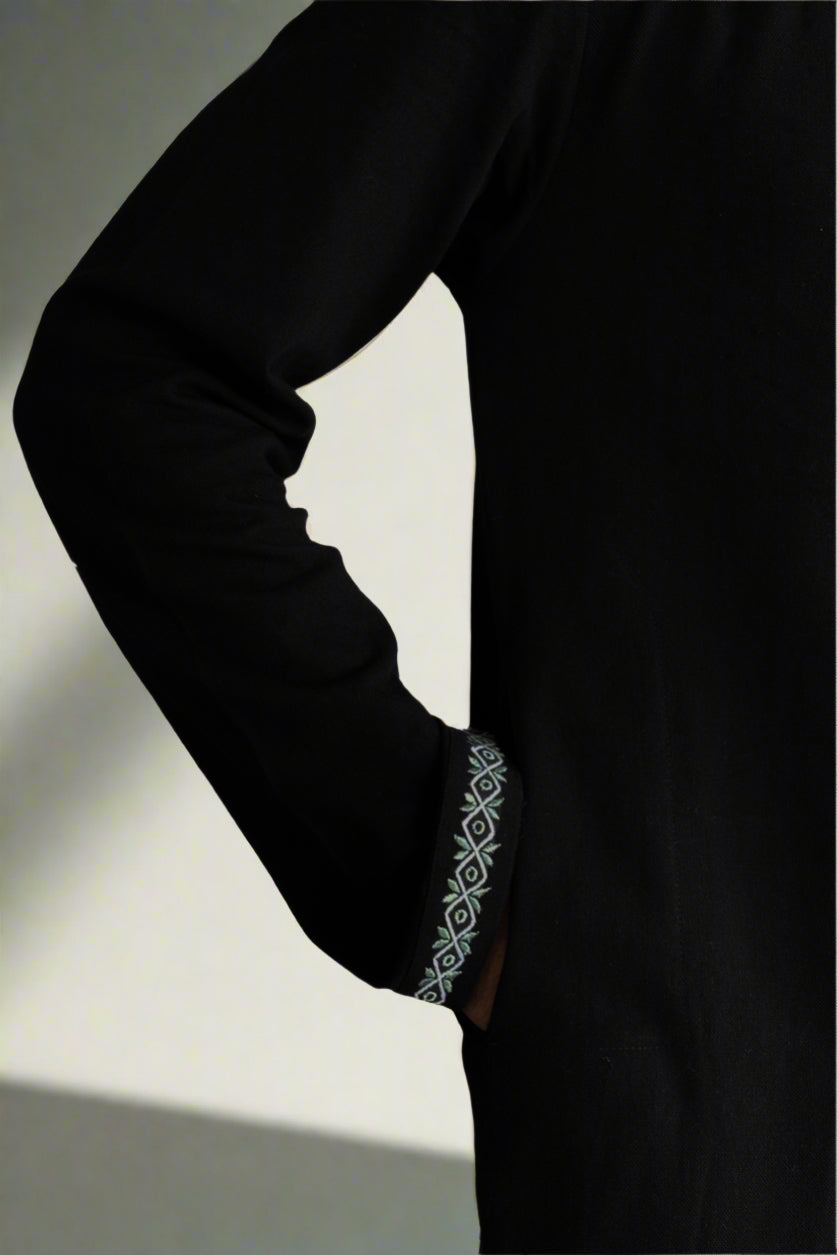 The deep black base is elevated with subtle geometric embroidery along the collar, placket, and cuffs, echoing the balance of light and shadow. Minimal yet festive, the Eclipse Kurta is designed to move effortlessly from intimate gatherings to grand celebrations, embodying the spirit of Jashn by HOT.