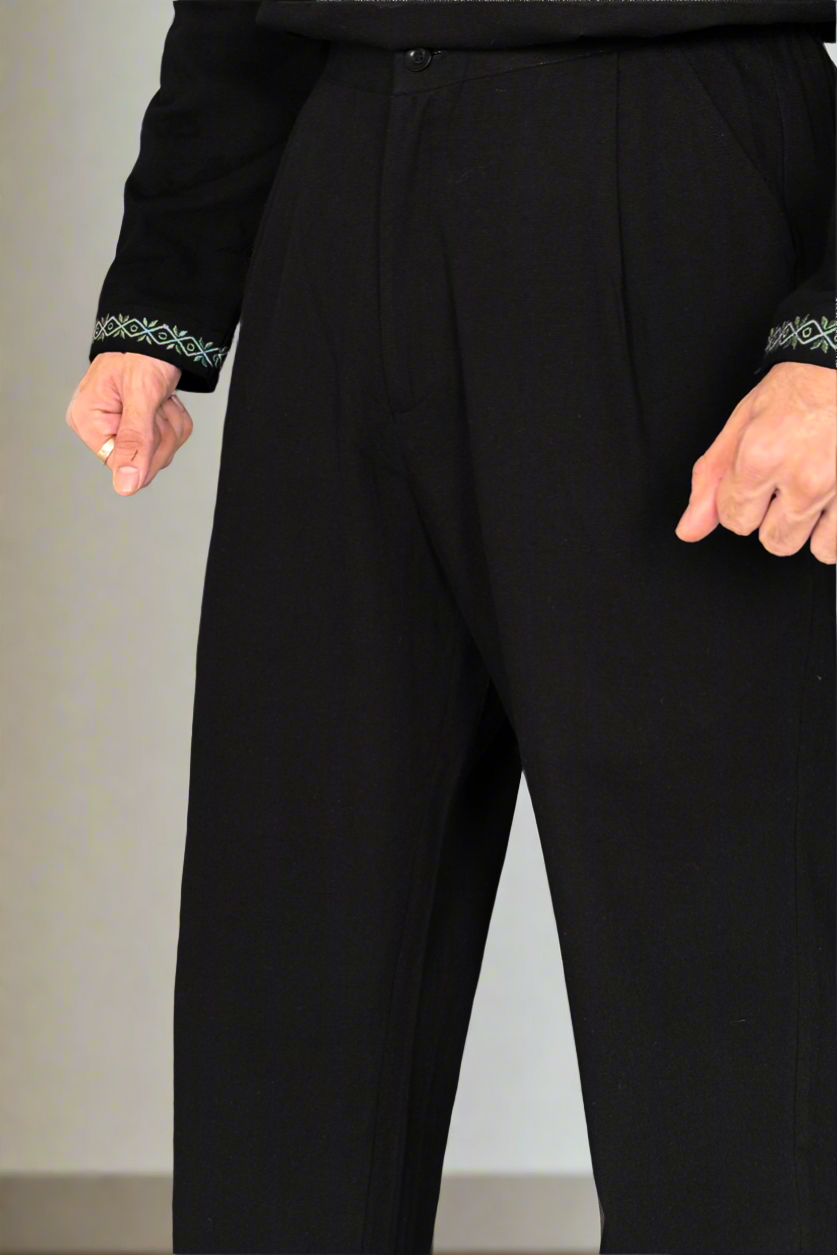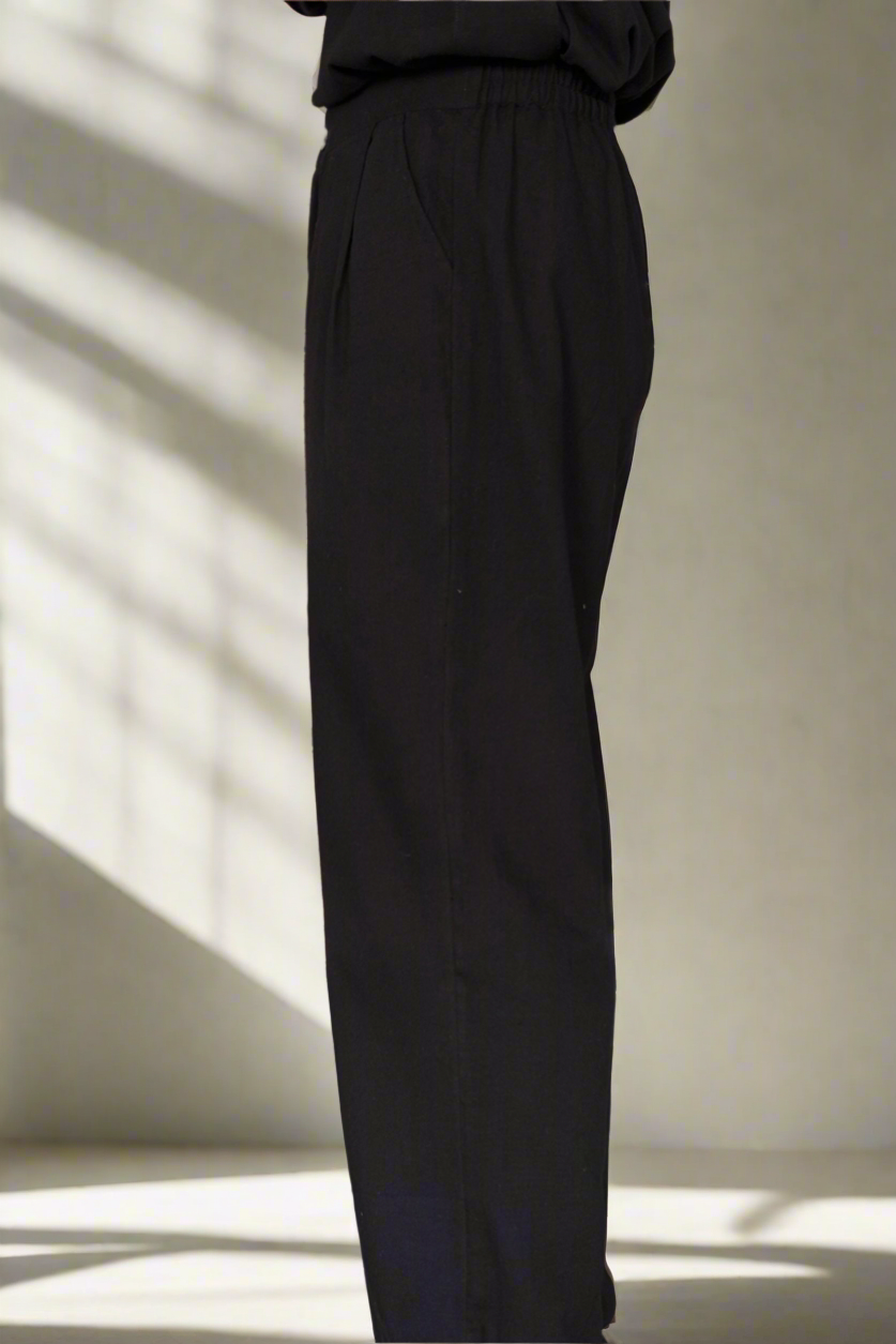 Crafted in breathable Kala cotton, the Eclipse Pants embody effortless elegance with a timeless edge. The deep black hue takes inspiration from the rare beauty of a solar eclipse, making them a versatile wardrobe essential. Designed with a relaxed straight cut, soft pleats, and a structured yet comfortable waistband, they strike the perfect balance between tradition and modern minimalism.