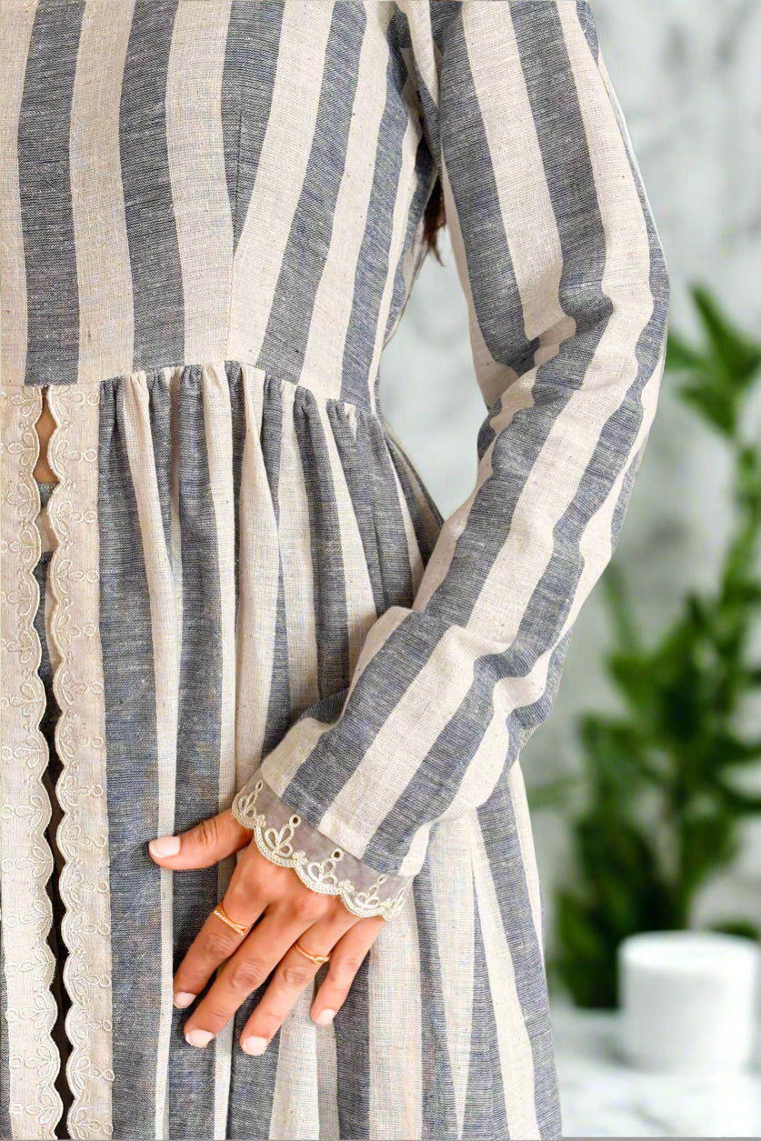 The Morning Tide Dress is a two piece set that captures the calm rhythm of the first waves meeting the shore. Made from sustainable Kala Cotton, this piece combines handwoven stripes with delicate lace-edged details for a look that is both nostalgic and modern.