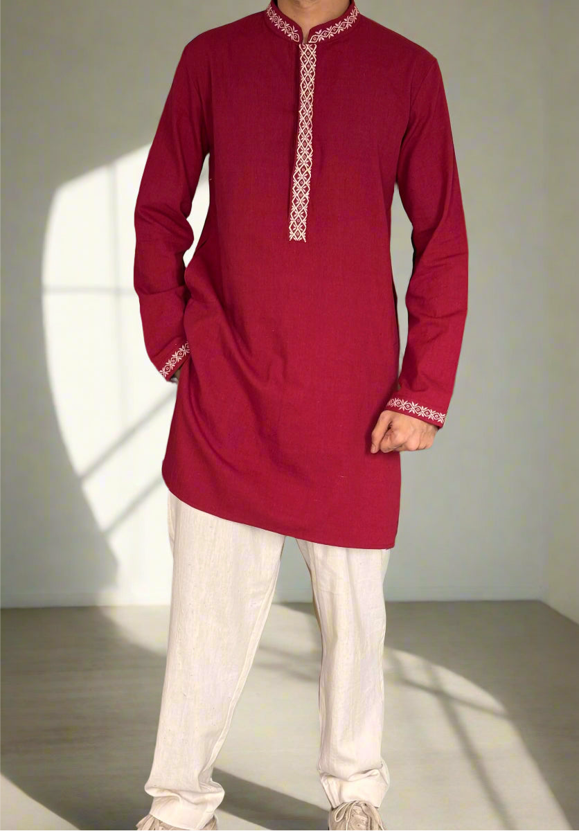 The Ruby Horizon Kurta captures the richness of festivity in a deep jewel-toned maroon. Crafted in 100% pure handwoven Kala Cotton — India’s heritage, eco-friendly fabric — it brings breathability and comfort without compromising elegance. Fine embroidery along the neckline, placket and cuffs adds a touch of artisanal finesse, balancing tradition with modern ease.