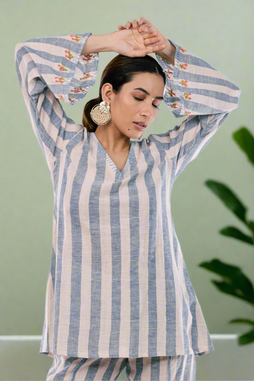 Crafted from 100% ethically grown Kala Cotton, this breezy striped top is a love letter to comfort and craftsmanship. The soft blue and off-white palette brings a coastal calm, while the hand-embroidered floral cuffs add a quiet charm — like the detail only you’d notice.