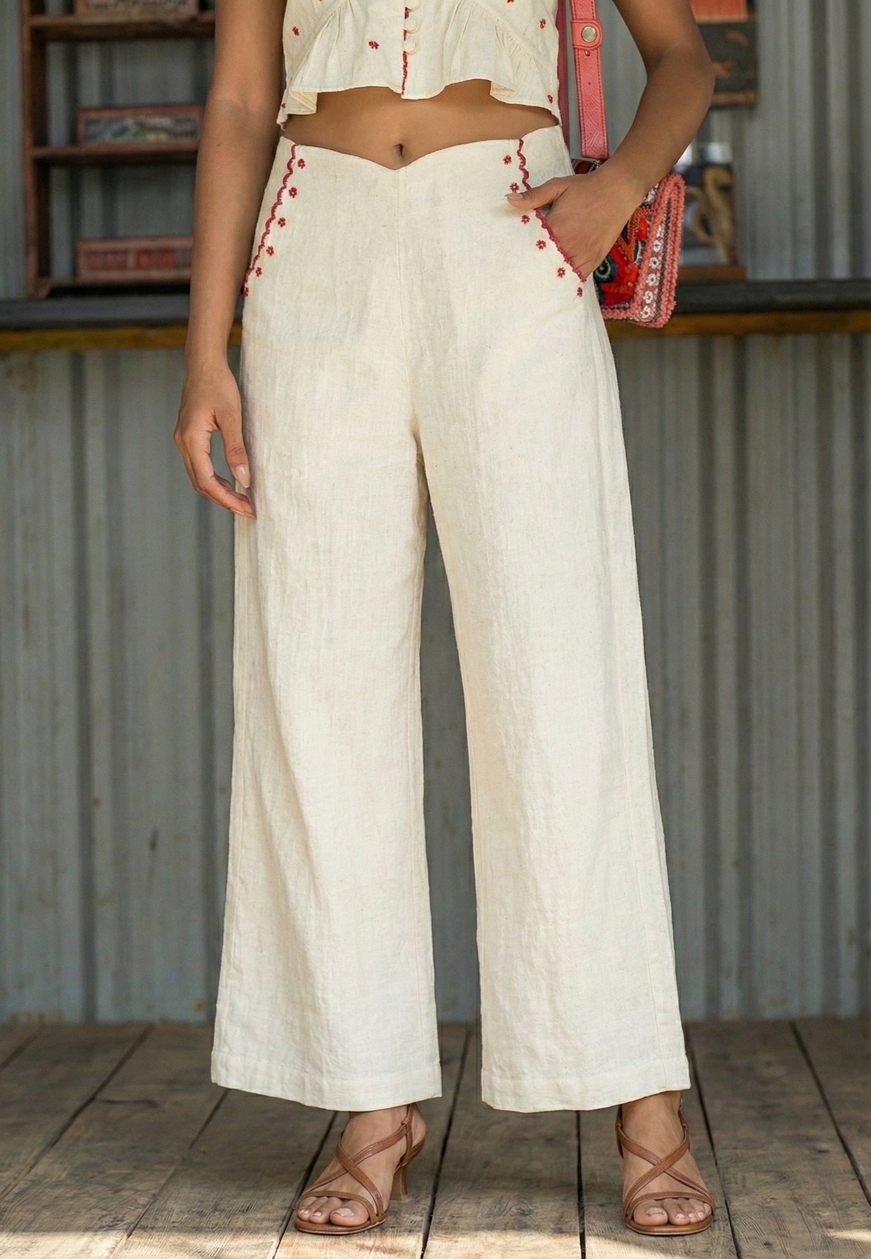 Thoughtfully designed with a high-rise fit and functional pockets, these pants pair beautifully with cropped tops, cotton shirts, or kurtas. Naturally breathable and gentle on the skin, they’re ideal for warm weather and all-day wear.