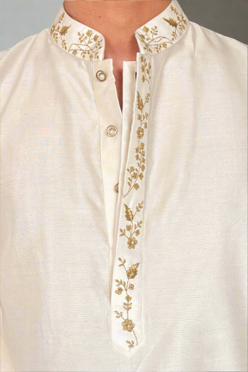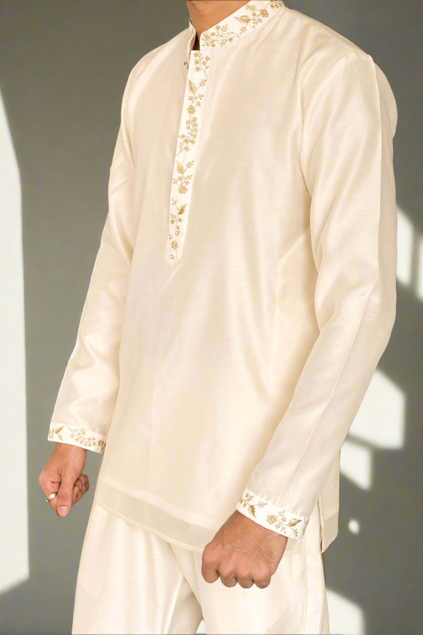 Radiating timeless charm, the Starlit Glow Kurta is crafted in luxurious silk chanderi, bringing together understated elegance and artisanal finesse. The kurta features delicate golden embroidery along the collar, placket, and cuffs — reminiscent of starlight dancing across a midnight sky. Lightweight yet regal, it blends tradition with modern sophistication, making it perfect for festive evenings and special occasions.