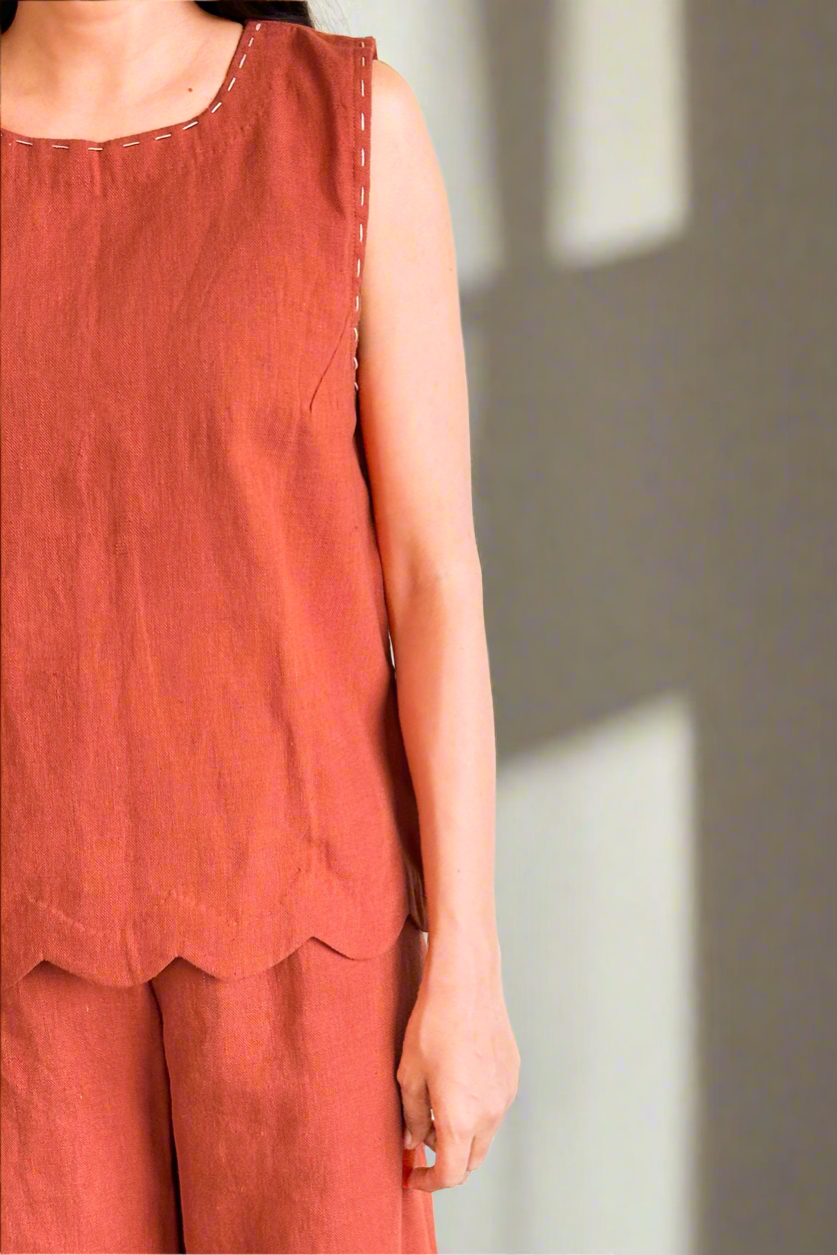 Bask in the warmth of handcrafted elegance with the Tangerine Glow Set. Made from 100% pure handwoven Kala cotton, this coord set radiates comfort and craftsmanship. The sleeveless top features delicate scallop detailing and contrast hand-stitching along the edges, paired with fluid trousers that mirror the same graceful finish.