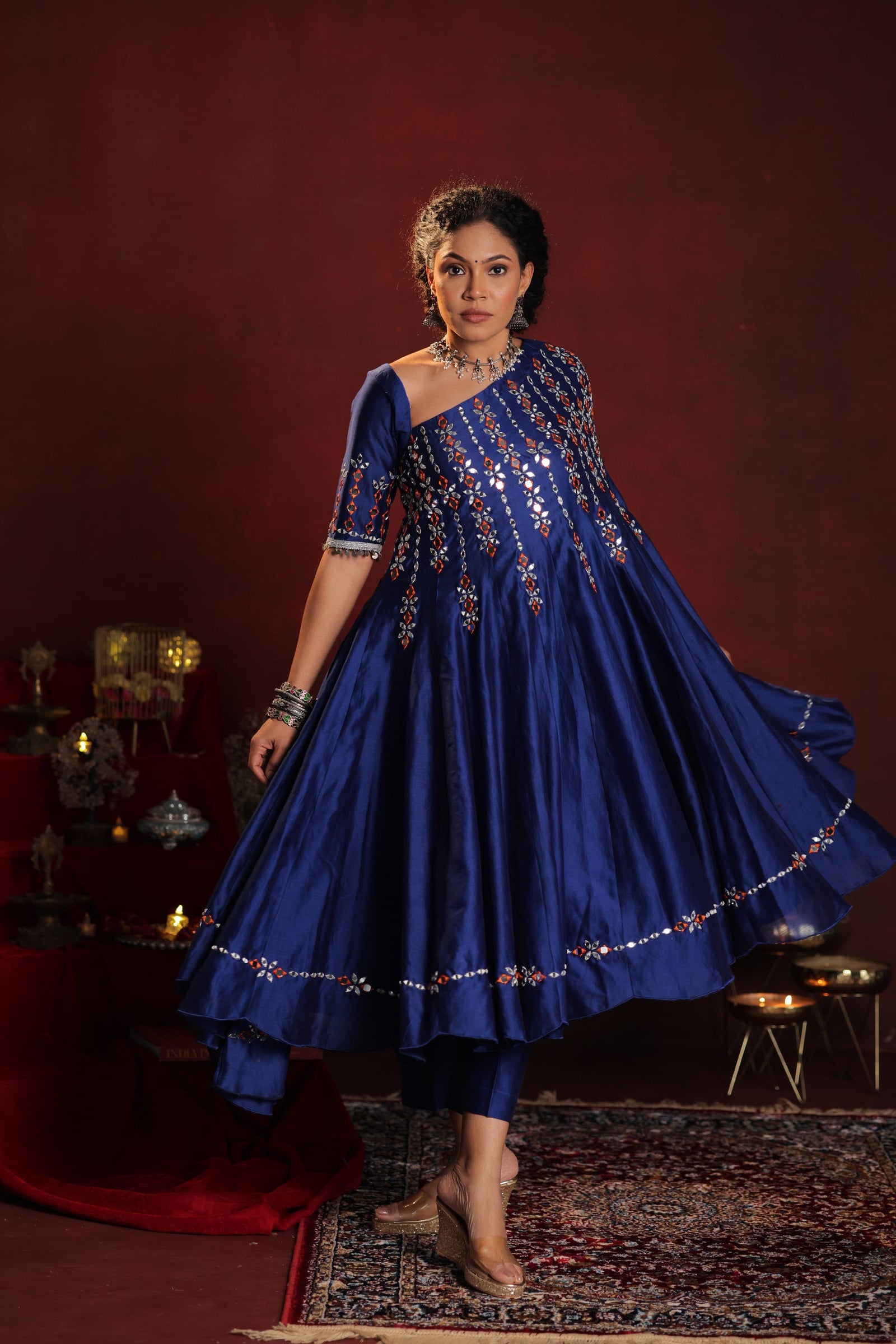 Indulge in the luxurious experience of our Twilight Treasure set, handcrafted by seasoned artisans with silk chanderi material. Featuring intricate mirrorwork, embroidery, and handwork, this set includes a top and bottoms for an elegant and unique look. Elevate your wardrobe with a touch of luxury.
